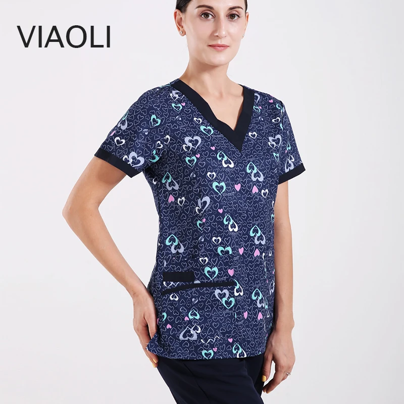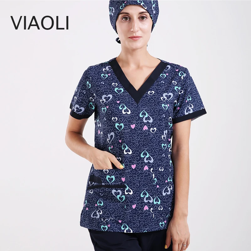 Discount Blue V-neck printed surgical gown medical suit, summer breathable cotton nurse scrub uniform ,top and pants