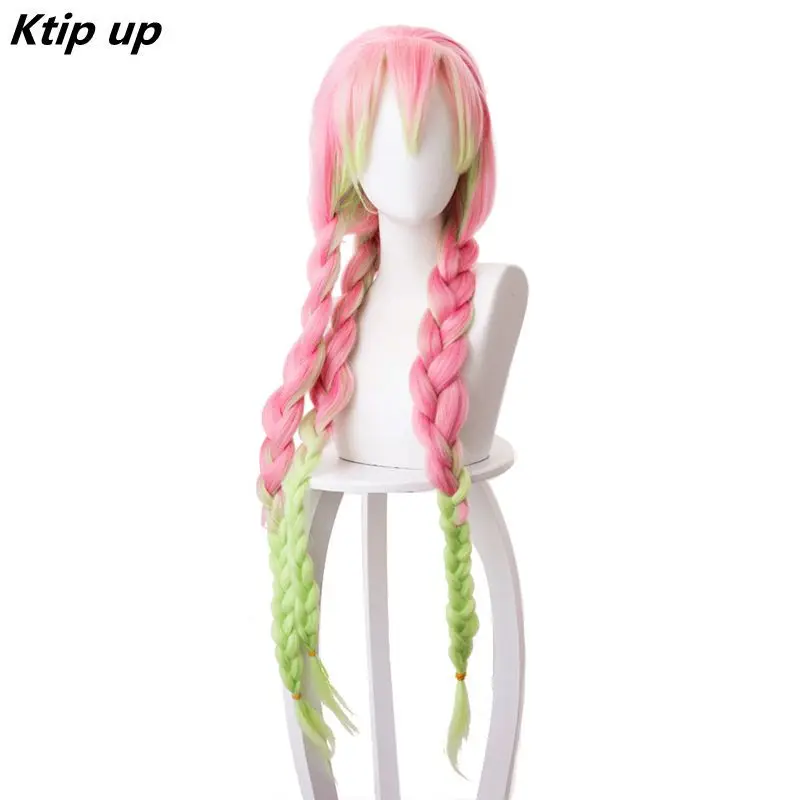 » Free Shipping Ktip Up Kanroji Mitsuri Anime Demon Slayer: Kimetsu No Yaiba Women Cosplay Wig Green Pink Colorful Hair Braids Hair + Wig Cap