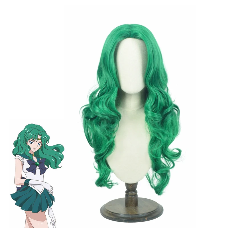 » Free Shipping Sailor Moon Kaiou Michiru Wigs Sailor Neptune Long Green Curly Heat Resistant Synthetic Hair Cosplay Costume Wig + Wig Cap