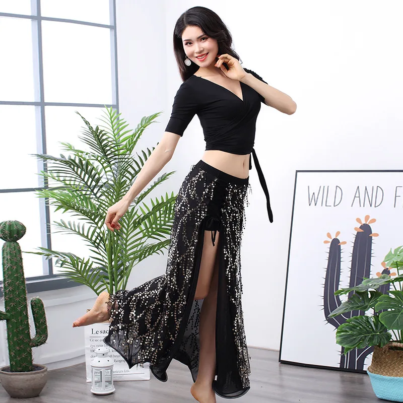 Best feecolor Belly dance practice clothes 2019 new sequins fringed skirt beginners practice clothes sexy performance costumes