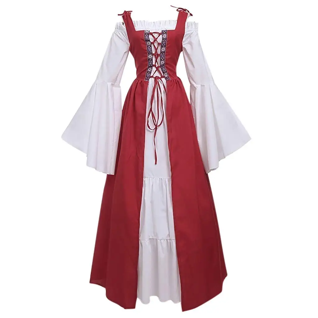 » Hot Product FEECOLOR 2 Pcs Costume Women Corset Vintage Dress Women's Retro Shoulder Elegant Maxi Dress for Party, Renaissance Club Clothes