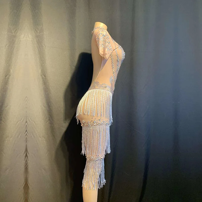 » Free Shipping Sexy mesh see-through silver rhinestone tassel dress birthday celebration party banquet evening dress concert ball singer dress