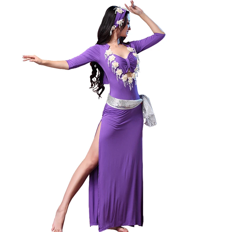 » Limited Ladies Autumn Winter Belly Dance Costumes Robe 3pcs A Set Robe Belt Headband Women Dancing Practice Costumes Bellydance Dress