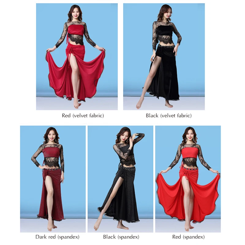» New 2pcs Women Belly Dance Costume Set Long Sleeves Floral Lace Top and Skirt Bellydance Training Clothes Oriental Dancing Outfit