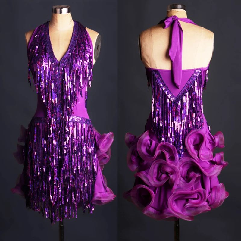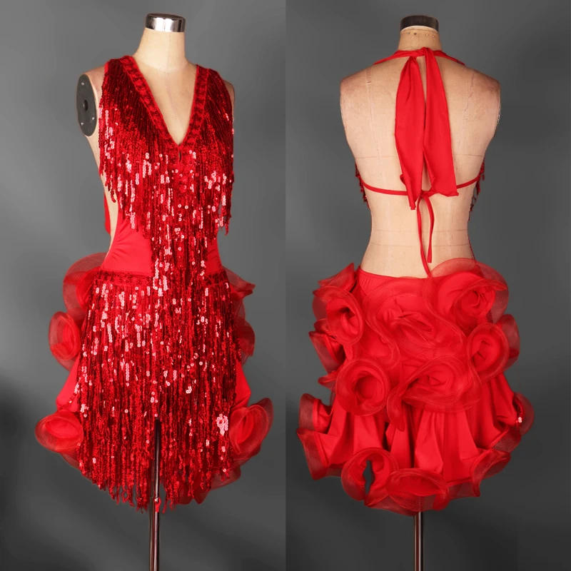 » Special New Women Latin Dance Sequin Tassel V Neck Dress Belly Dance Flower Skirt Bellydance Competition Outfit for Sumba Rumba Cha Cha