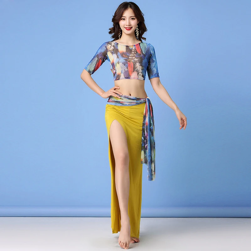 » Special Product 3pc Women Belly Dance Costume Set Top Belt Skirt Tie-dyed Floral Pattern Lady Dancewear V-neck Modal Bellydance Practice Clothes