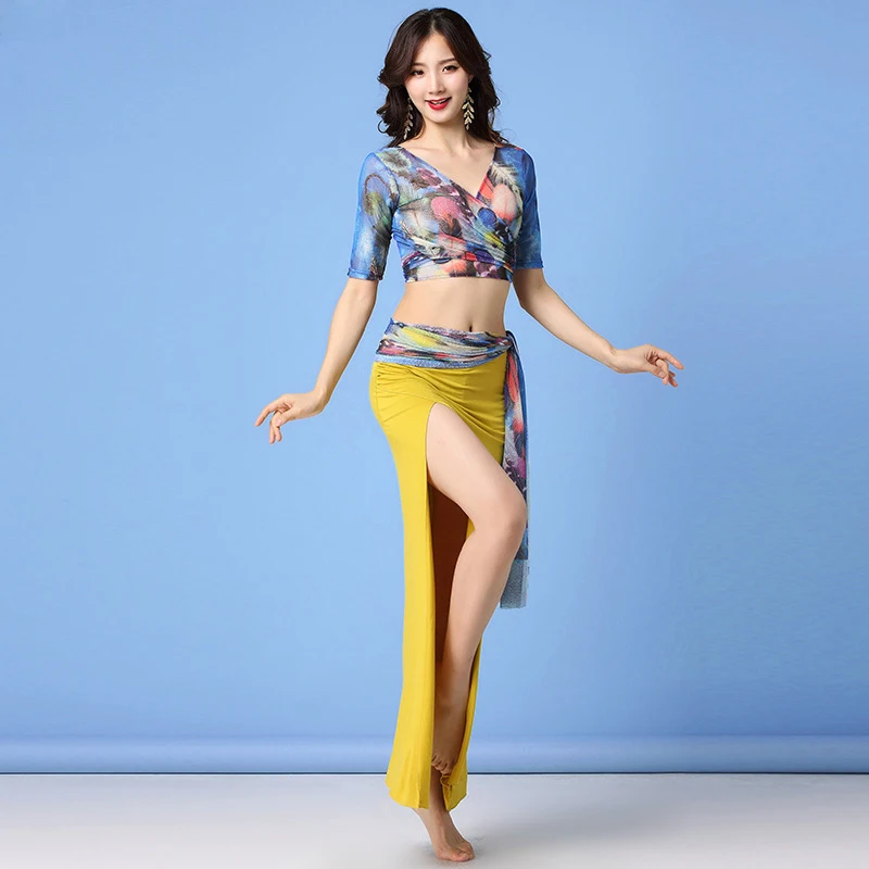 Special Product 3pc Women Belly Dance Costume Set Top Belt Skirt Tie-dyed Floral Pattern Lady Dancewear V-neck Modal Bellydance Practice Clothes