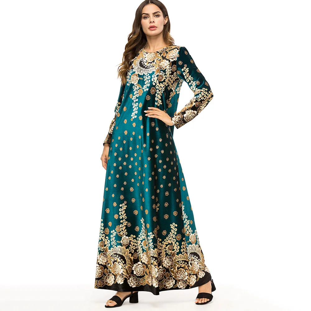 » Promo Long Sleeve Fashion Boutique Print Ankle-Length Dress Elegant Floral Long Muslim Robe Round Neck Pullover Retro Party Dresses