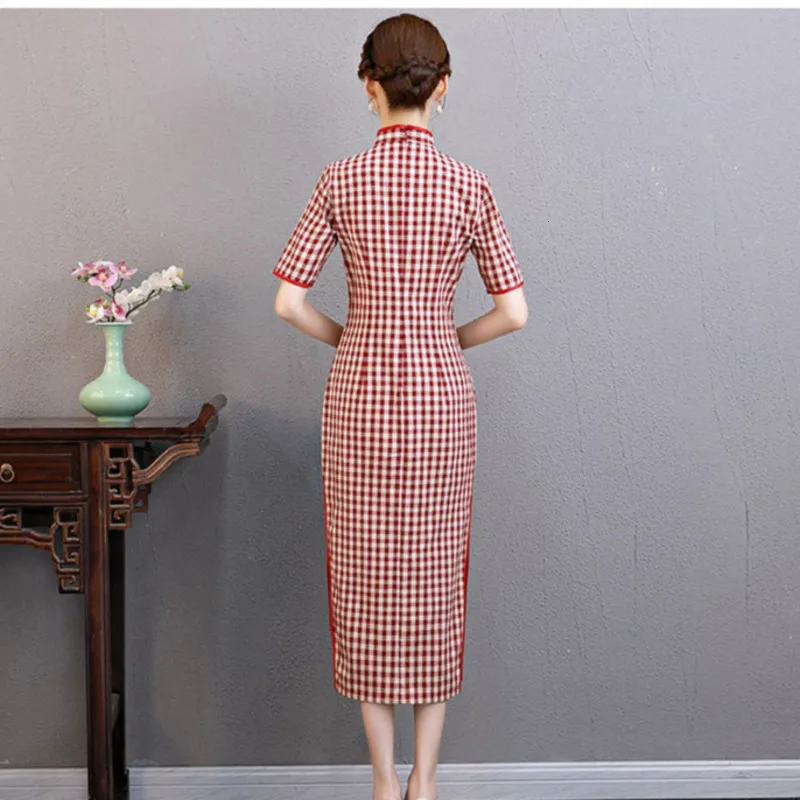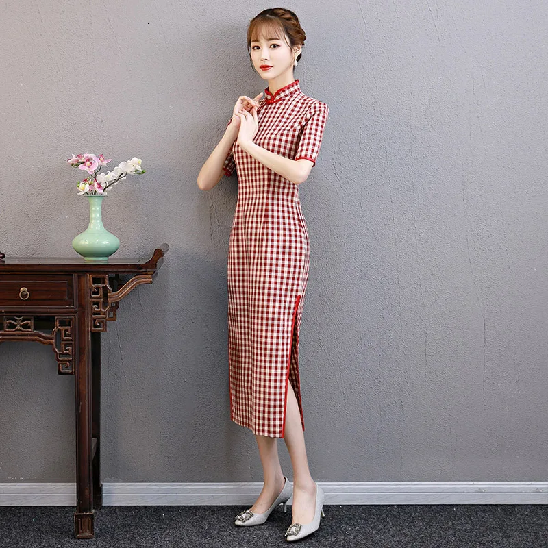 Get Sheng Coco Woman plaid Long Cheongsam qipao chinese dress Lattice Daily Classic Qipao Elegant Chinese Style Clothing