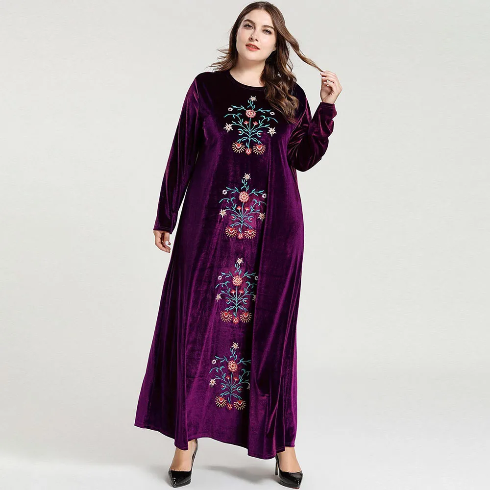 » Special Product Middle East large size women's fashion dignified purple velvet plant embroidered long-sleeved Muslim elegant dress