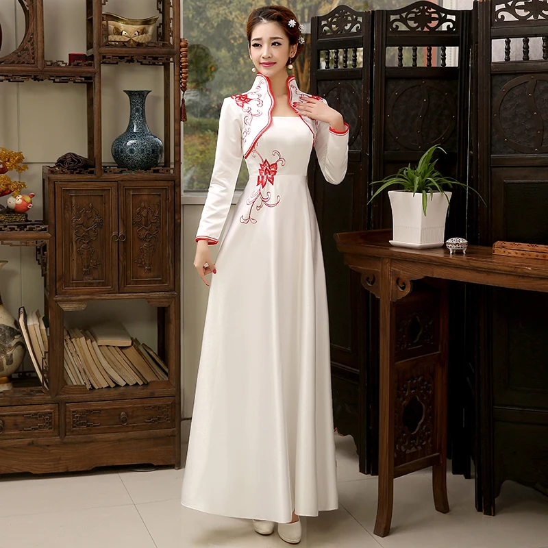 » Discount Autumn Winter New Women Embroidery Flower Satin Cheongsam Chinese Bride Wedding Dress Long Sleeve Evening Qipao Party Gowns